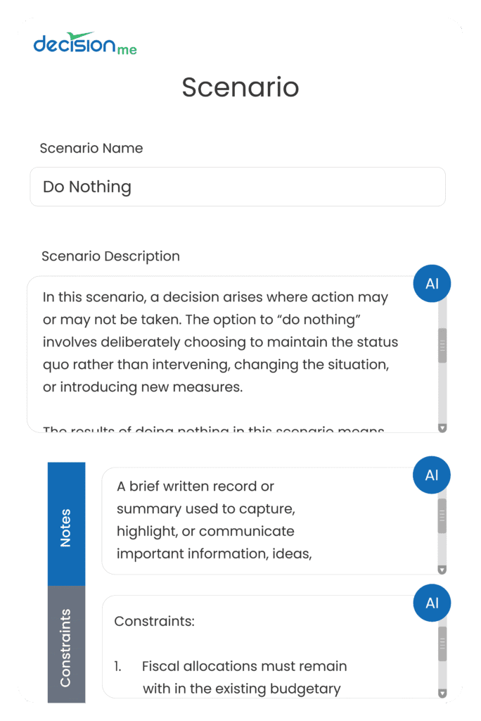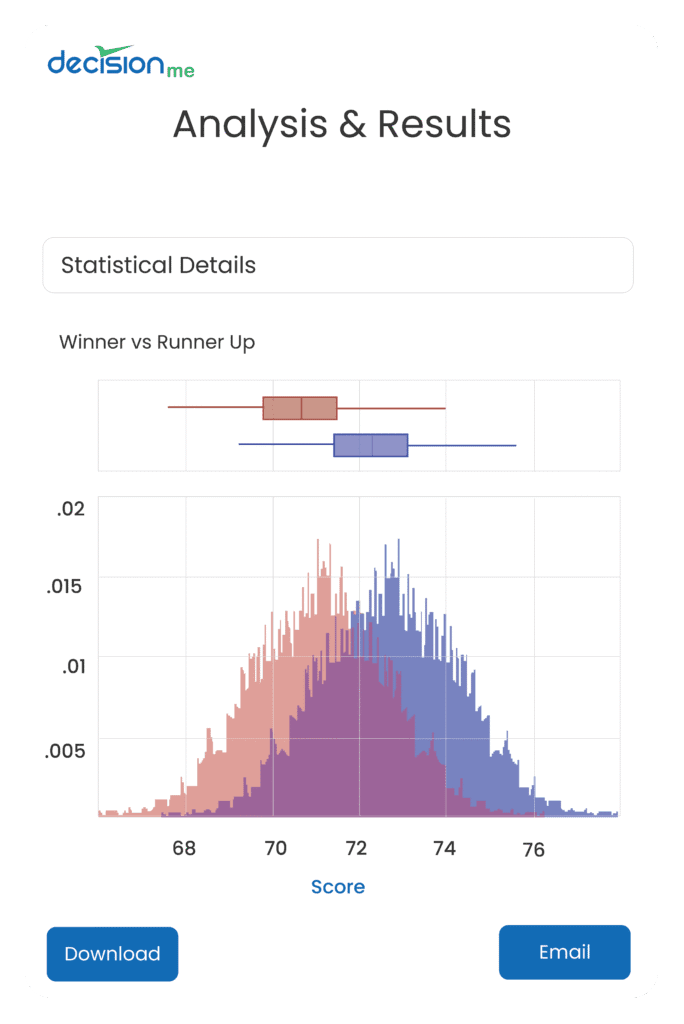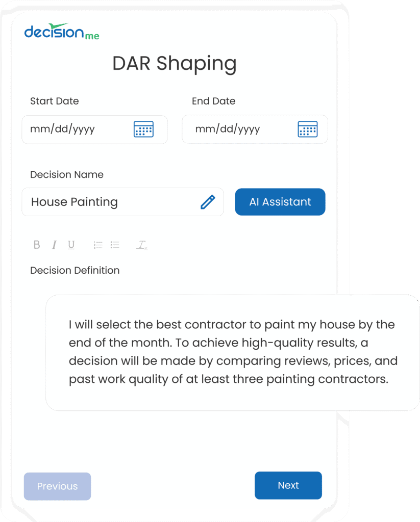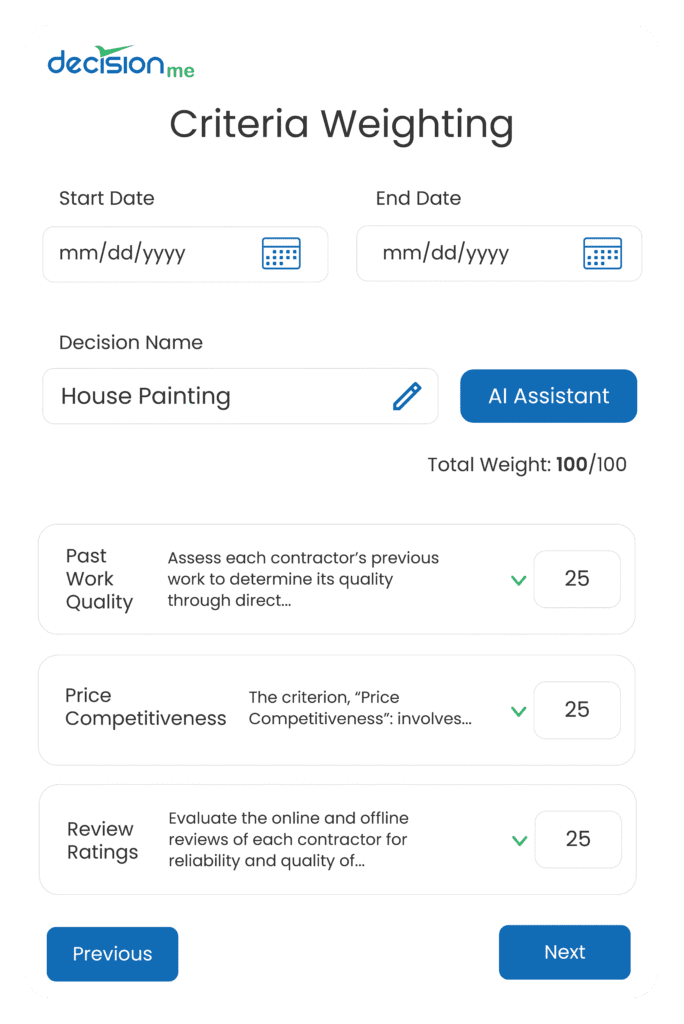 Resources Logos png jpg white png png Screens Make decisions that are right for you. Use AI to identify missing items. Pick the weight of each of your criterion Remove hidden biases that cloud your decisions Relish in the decision with data visualization